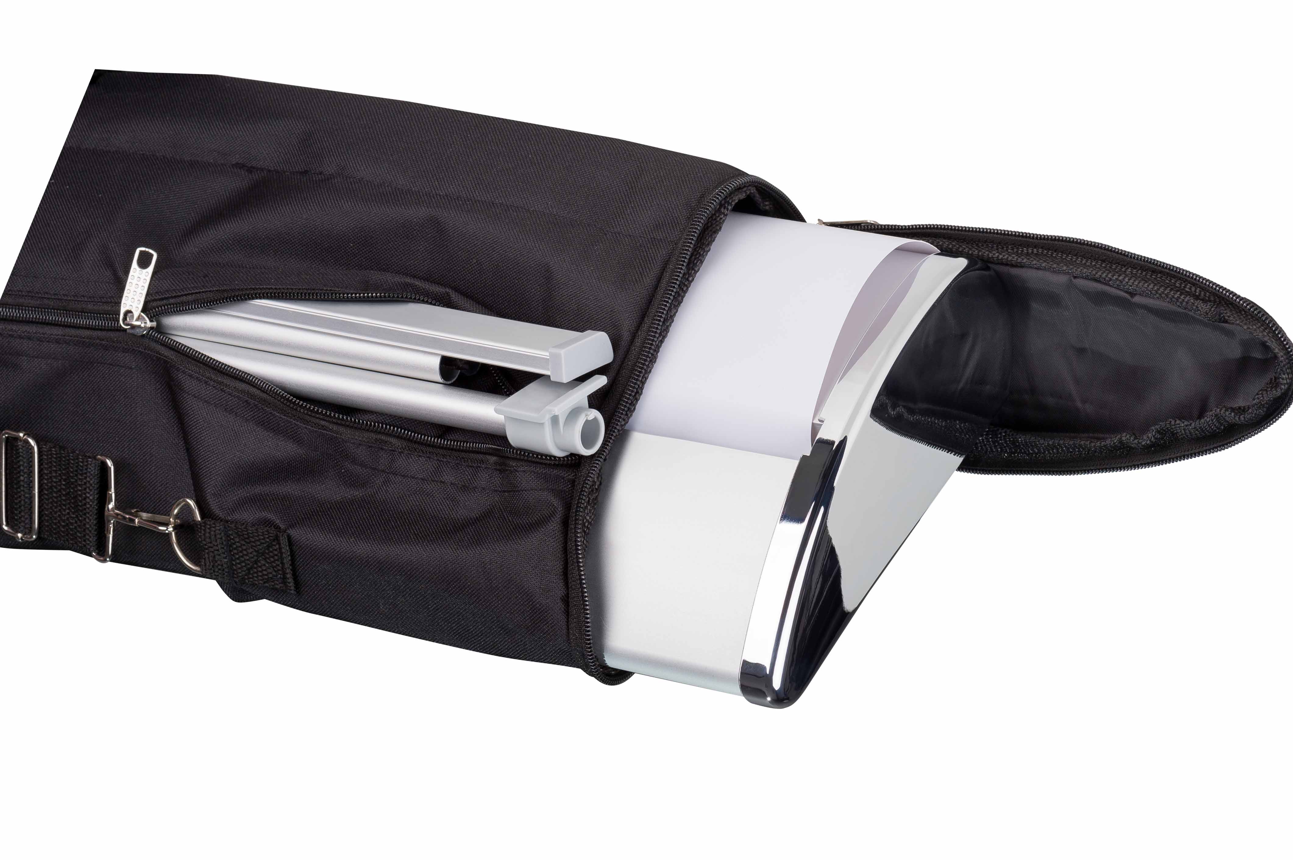 Wzmocniona, wyściełana torba ułatwi przenoszenie oraz przechowywanie roll-upa. Dołączony pokrowiec z zamkiem błyskawicznym na całej długości posiada dodatkową kieszeń przeznaczoną na maszt. Torba została wyposażona w specjalne okienko identyfikacyjne, dzięki któremu szybko zlokalizujesz właściwy roll up.